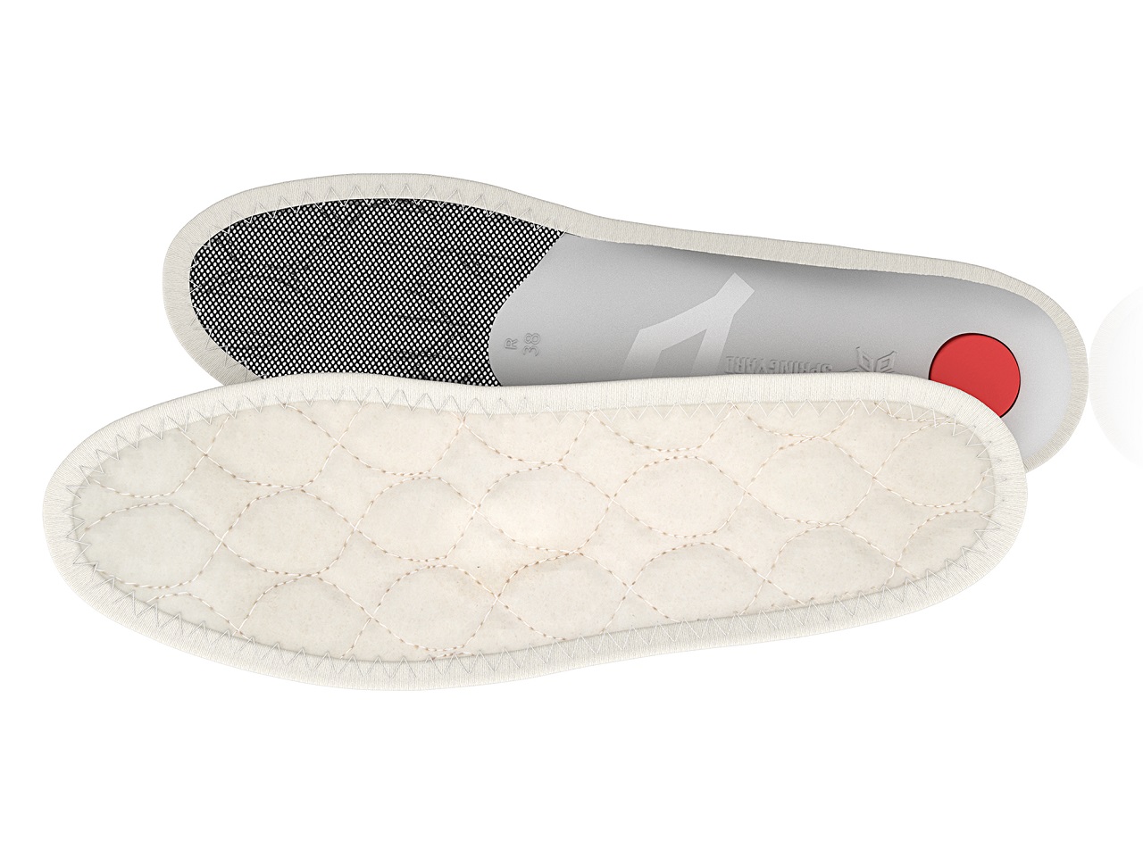 Uppbyggd fotbädd i värmande quiltad ull med mjukt mellanlager och isolerande aluminium. Dämpning i häl och hålfotsstöd förbättrar hållning samt förebygger hälsporre. Ullen andas, värmereglerar och absorberar fukt vilket håller skon fräsch. Handgjord.